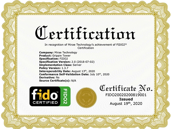 미래테크놀로지는 2016년 FIDO UAF 1.0 규격에 대한 서버, 안드로이드, iOS 클라이언트 및 인증 장치에 대해 FIDO 얼라이언스의 제품 인증을 획득한 바 있다.