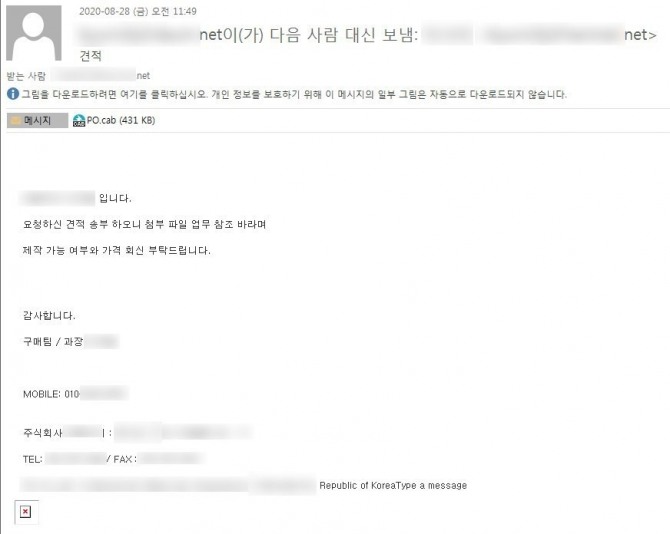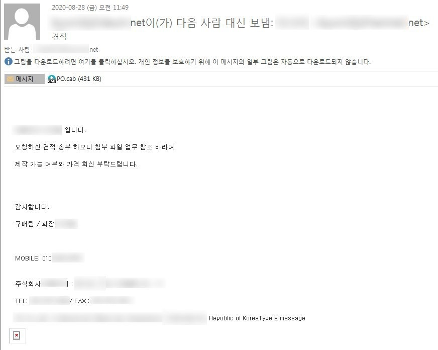이미지 확대보기10일 안랩에 따르면 최근 견적 의뢰 메일로 위장해 사용자의 계정 정보를 노리는 악성코드 유포 사례를 발견했다. 공격자는 ‘견적’이라는 제목으로 악성파일을 포함한 압축포맷 파일(.cab)을 첨부해 견적의뢰 위장 메일을 발송했다.