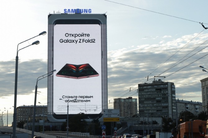 러시아 모스크바 하이드로프로젝트(Hydroproject)에 설치된 '갤럭시 Z 폴드2' 옥외광고. 사진=삼성전자