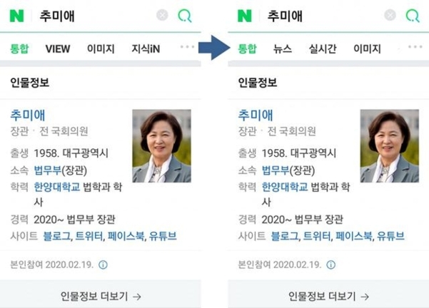 앞서 지난 19일 국민의힘 송파병 당협위원장 김근식 경남대 교수는 네이버에서 ‘추미애’를 검색한 결과 상단 탭 순서가 보통 정치인과 다르고, 영문자판 상태로 검색하면 바로 자동전환된 결과가 보이지 않는다며 ‘포털 통제’ 의혹을 제기했었다.