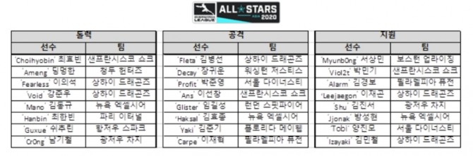 반면 ‘Danteh’ 단테 크루즈(휴스턴 아웃로즈), ‘Dogman’ 더스틴 보우만(애틀랜타 레인), ‘Super’ 매튜 델리시(샌프란시스코 쇼크), ‘Space’ 인디 할펀(LA 글래디에이터즈), ‘Poko’ 가엘 구제시(필라델피아 퓨전) 등 각 팀 대표 선수들은 변함 없는 실력과 인기로 작년에 이어 올해도 팬들의 선택을 받았다고 회사 측은 설명했다.