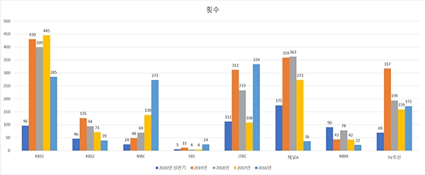 한국방송광고진흥공사(KOBACO)의 제출자료에 따르면 지난 2016년부터 올해 8월까지 공익방송 방영 횟수가 가장 적었던 곳은 SBS(3821회)였다.