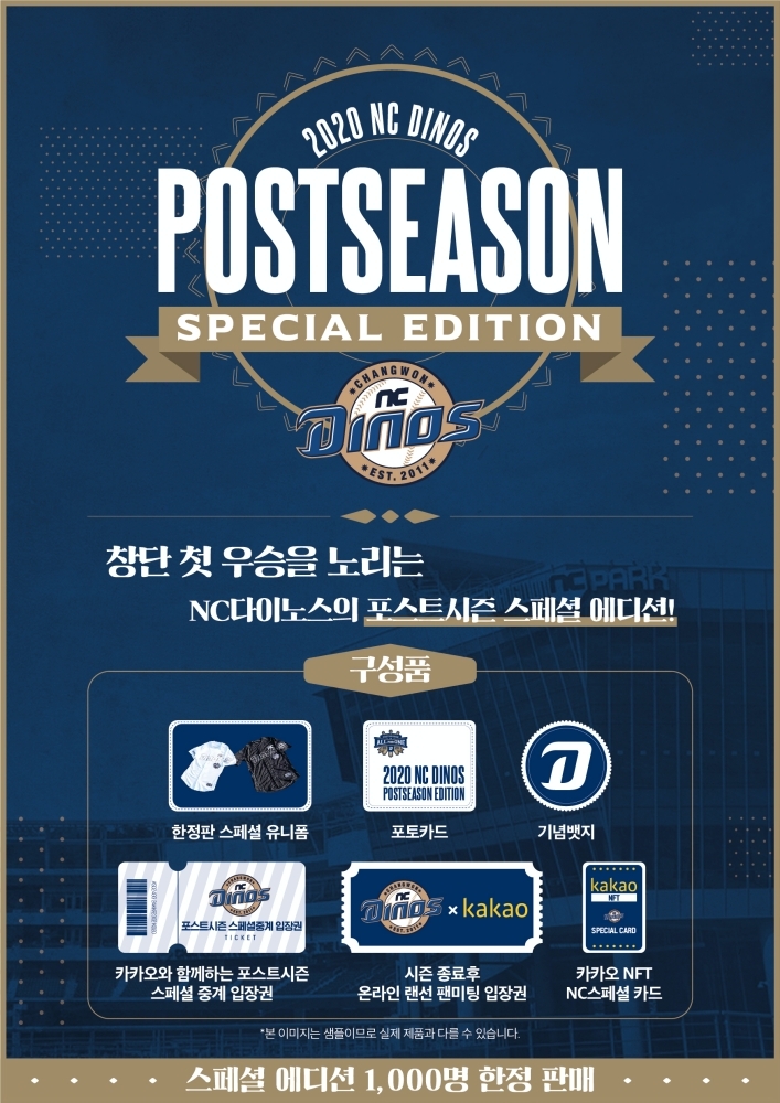 NC 다이노스 팬 1000명에게 판매하는 이번 ‘2020 프로야구 포스트시즌 스페셜 에디션’은 △스페셜 굿즈 △멤버십 가입자만 볼 수 있는 카카오TV 자체중계 △온라인 팬미팅 입장권 △스페셜 NFT(블록체인 기반 토큰) 카드 제공 등의 혜택을 제공한다.
