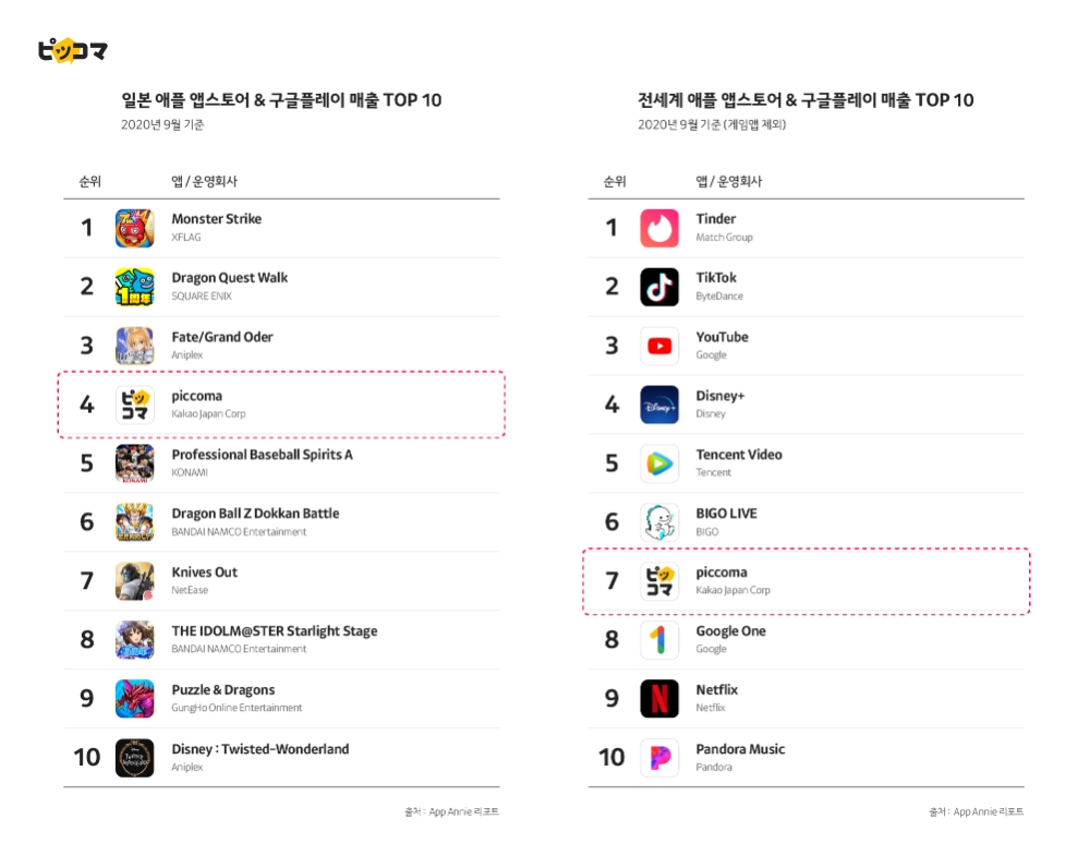 이미지 확대보기카카오재팬은 9일 글로벌 앱 조사업체 앱애니(App Annie)의 9월 월간 리포트 기준으로 픽코마가 양대 앱마켓(애플 앱스토어,구글플레이)의 전 세계 만화 및 소설 앱 중 매출 1위, 비게임 앱 기준 매출 7위에 올라섰다고 밝혔다. 일본 진출 4년 만에 이룬 성과다.