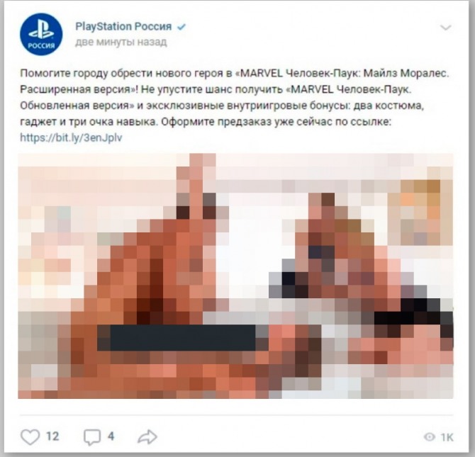 ‘스파이더 맨 : 마일즈 모랄레스’ PS5의 게임 런칭 타이틀로, 내주 러시아 정식 출시를 앞두고 관련 정보를 전달하기 위한 게시물이다. 글과 함께 올라온 사진에는 ‘PS5’, ‘스파이더 맨’과 무관한 남녀간 성행위 장면이 그대로 노출돼 있다.
