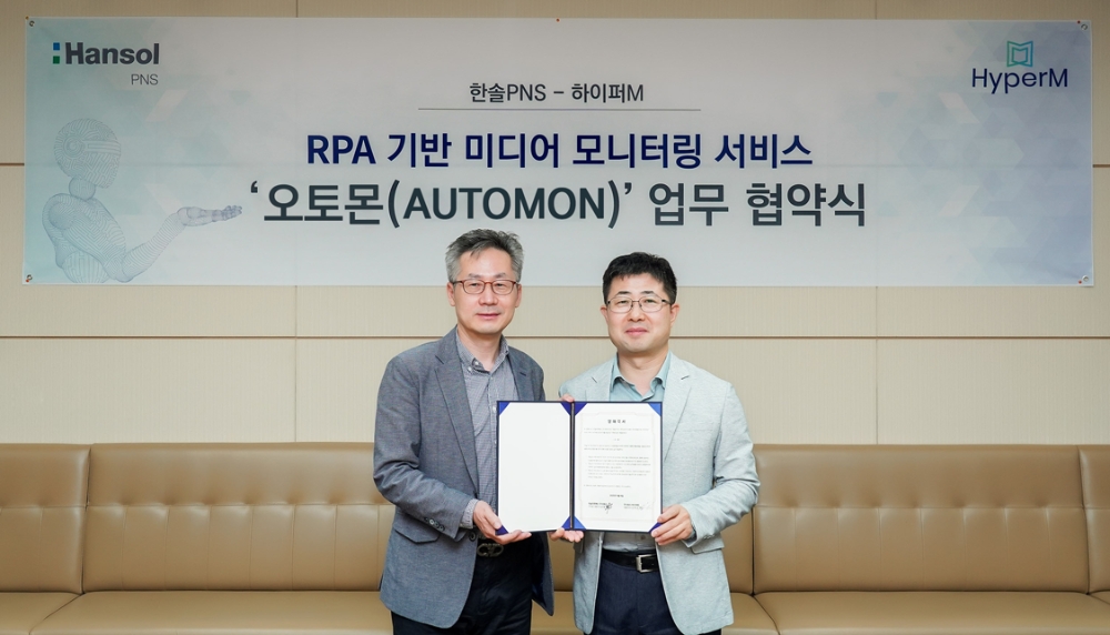 이미지 확대보기한솔PNS와 하이퍼앰은 전략적 업무협약(MOU)을 체결하고 오토몬’으로 정부부처와 공공기관을 포함, 국내외 기업과 주요 홍보·광고대행사를 대상으로 수작업 기반 반복 업무에서 벗어나 비용과 시간을 획기적으로 개선한 서비스를 제공하기로 했다. 이를 통해 고객은 변화된 미디어 환경에 신속하고 유연하게 대응할 수 있을 것이라고 두 회사 측은 설명했다.