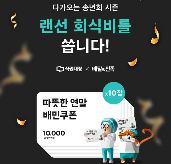 기업용 모바일 식권 '식권대장'을 운영하는 벤디스(대표 조정호)는 '배달의민족(이하 배민)' 쿠폰으로 고객사에 랜선(온라인을 통한 비대면) 회식비를 지원했다고 24일 밝혔다.벤디스는 식권대장을 도입한 기업의 인사·총무 담당자를 대상으로 지난 2주동안 이벤트 응모를 진행했다. 신종 코로나바이러스 감염증(코로나19)으로 인해 사회적 거리두기가 강화되면서, 한자리에 모이는 송년회 대신 팀 단위로 임직원들이 각자의 집에서 배달 음식을 통해 자유롭게 한 해를 마무리할 수 있도록 이벤트를 기획했다.