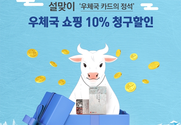 과학기술정보통신부 우정사업본부(본부장 박종석)는 설 명절을 맞아 27일부터 2월 28일까지 우체국 제휴신용카드 '우체국 카드의 정석'과 함께하는 우체국쇼핑 할인 이벤트를 실시한다고 26일 밝혔다.우체국쇼핑몰에서 '우체국 카드의 정석' 제휴신용카드로 상품을 구매하면 10% 청구할인을 받을 수 있다. 고객은 전월 실적과 관계없이 하루 최대 5만원까지 돌려받을 수 있으며 10% 청구할인 혜택은 행사 기간 내내 제공된다.