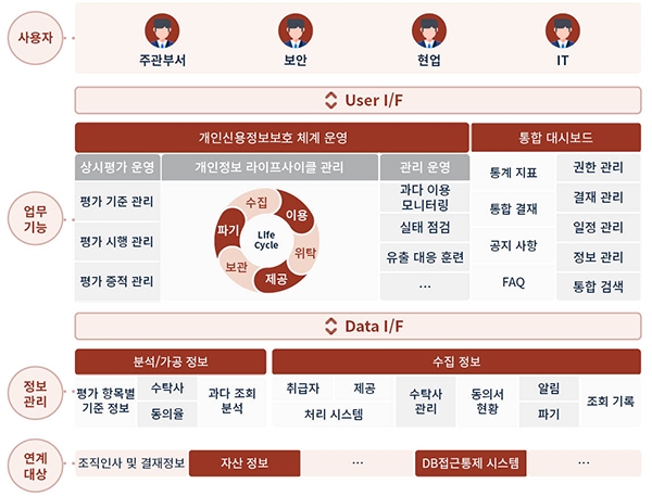 특히 개인정보보호 업무의 특성상 현업의 비즈니스 업무와 직접적으로 연계되는 점을 고려해, 현업의 정기/비정기 업무 및 관련 데이터를 유기적으로 연계 가능하도록 함으로써 개인(신용)정보보호 업무가 상시운영 체계로 전환되는 것을 목표로 하고 있다. 시스템은 2021년 상반기 내 구축을 완료할 계획이다.