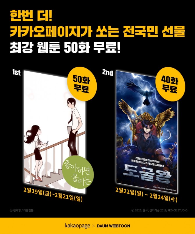 카카오페이지는 “설 연휴를 맞아 진행했던 ‘나 혼자만 레벨업’ 작품 이벤트에 5일 동안 350만명 이상이 모이는 등 뜨거운 사랑을 받았다. 이에 감사하는 마음으로 ‘좋아하면 울리는’과 ‘도굴왕’ 이벤트를 준비하게 되었다”며 “앞으로도 많은 이용자들에게 카카오페이지의 좋은 IP들을 소개할 수 있도록 보다 다양하고 재미있는 프로모션을 준비하겠다”고 말했다.