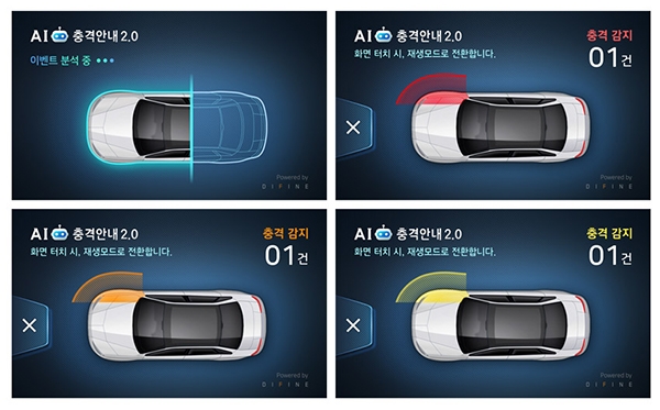 충격 위치와 충격량 데이터를 시각화한 UI 디자인도 적용해 시인성을 높여 알람을 받은 차주가 직관적으로 상황 파악이 가능하도록 도와준다. 블랙박스 화면을 터치하면 재생모드로 전환돼 즉시 현장을 확인할 수 있어 문콕, 스침, 물피도주 등의 사고를 신속한 대처가 가능하다.
