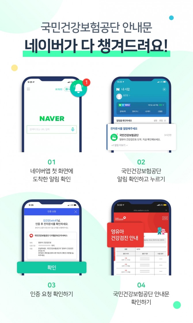 네이버와 국민건강보험공단은 오는 12일부터 건강검진표 및 안내문, 영유아 검진표, 대사 증후군 안내문, 본인부담환급금 지급 신청 안내, 지역가입자 자격변동 안내문 등 37종의 전자 문서를 발행한다고 11일 밝혔다. 순차적으로 발행 문서를 총 715종으로 확대해 이용자들은 쉽고 빠르게 네이버 앱을 통해 열람서비스를 이용할 수 있다.