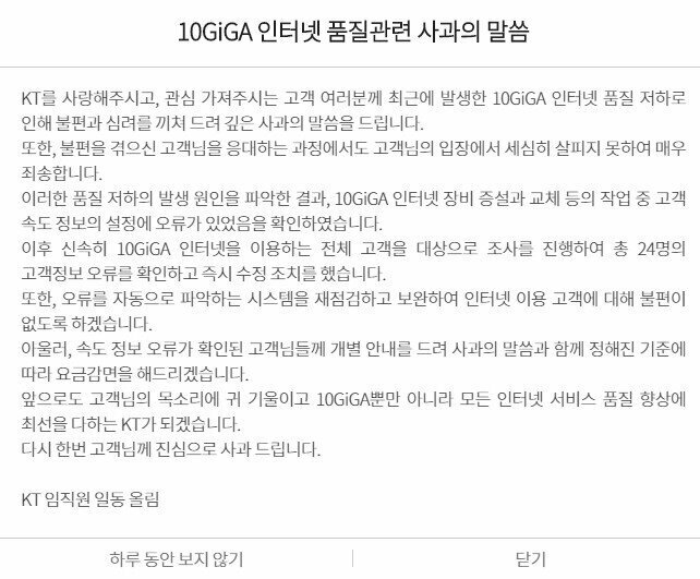 이어 "앞으로 오류를 자동으로 파악하는 시스템을 재점검하고 보완해 인터넷 이용 고객이 불편을 겪지 않도록 하겠다"며 "속도 정보 오류가 확인된 고객들에게는 개별 안내를 드려 정해진 기준에 따라 요금을 감면해드리겠다"고 밝혔다.