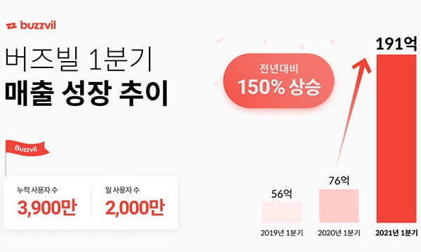 버즈빌은 1분기 191억원의 매출을 올렸다고 29일 발표했다. 이는 2020년 1분기(76억원) 보다 150%, 2019년 1분기(55억원) 보다 243% 각각 증가한 실적이다.