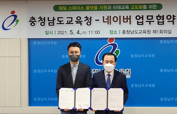 이미지 확대보기네이버와 충청남도교육청은 지난 4일 교육청사에서 업무협약식을 체결하고, 앞으로 충남의 일선 교육 현장에서 웨일 스페이스를 활용해 보다 편리한 지도환경과 효율적인 학습환경을 구축해 가기로 했다.