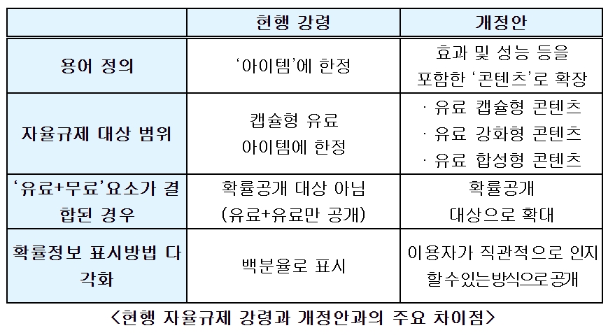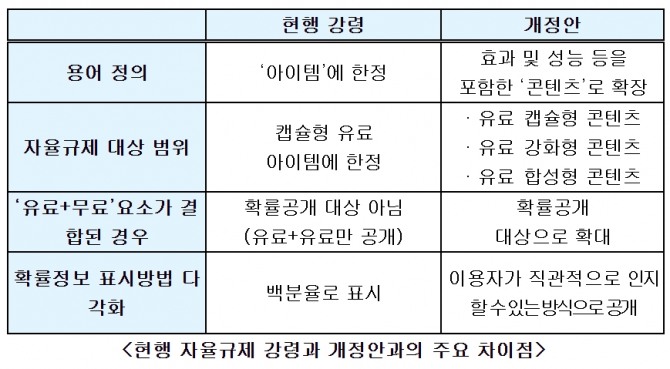 자율규제 강령 개정안에 따르면 확률형 콘텐츠 대상을 ▲캡슐형 ▲강화형 ▲합성형 콘텐츠로 확대하고, 유료와 무료 요소가 결합된 경우 개별 확률을 이용자가 명확하게 인지할 수 있는 방식으로 공개해야 한다.
