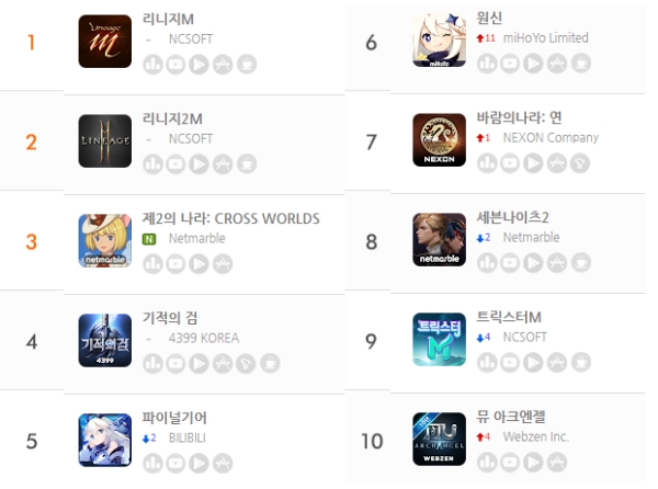 한편 '제2의 나라'가 상승하면서 매출 최상위권에 변동이 생겼다. 한 때 3위를 놓고 겨루던 '기적의 검'과 '파이널 기어'는 모두 1계단씩 순위가 떨어졌고 '트릭스터M'은 신캐릭터를 추가한 '원신', 대규모 업데이트를 한 '세븐나이츠2' 등에 밀려 9위까지 내려왔다.