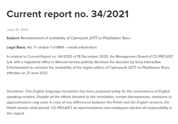 개발사 CD 프로젝트, 21일 플레이스테이션판 재발매 알려
