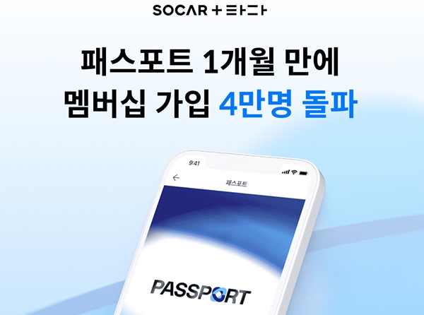 쏘카와 타다의 통합 모빌리티 멤버십 '패스포트'가 출시 한 달 만에 가입자 4만명을 넘어섰다.모빌리티 혁신 플랫폼 쏘카(대표 박재욱)와 타다 운영사 VCNC가 지난달 23일 출시한 통합 모빌리티 멤버십 패스포트가 이틀 만에 가입자 1만명을 돌파한데 이어 한 달 새 가입자 4만명이 넘었다고 23일 밝혔다.