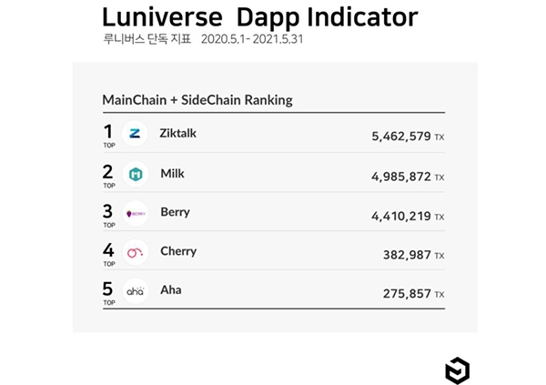 람다256은 지난 26일 공개한 2021 루니버스 연차보고서에서 디앱의 활성화 지표로 중요하게 사용되는 트랜잭션 수(2020.5.1~2021.5.31)를 기준으로 루니버스 TOP 5를 선정했다.