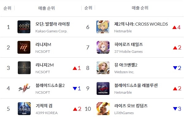 이미지 확대보기'오딘' 밑으로 엔씨소프트 '리니지M', '리니지2M', '블레이드 앤 소울 2' 등이 건재한 가운데 빌리빌리 '미니어스'가 11위로 밀려나며 최상위권 '터줏대감'인 MMORPG들이 톱10을 접수했다.