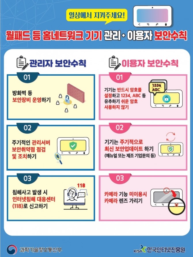 이에 과기정통부는 해킹 등 사이버위협으로부터 국민이 안전하고 편리하게 홈네트워크 기기를 이용할 수 있도록 마련된 '홈·가전 IoT보안가이드'에 따라 홈네트워크 기기 제조 기업은 안전한 소프트웨어 개발보안, 알려진 보안취약점 점검·조치할 것을 당부했다. 또 이용자는 기기에 안전한 암호 설정 등 보안수칙을 지켜줄 것을 당부했다.