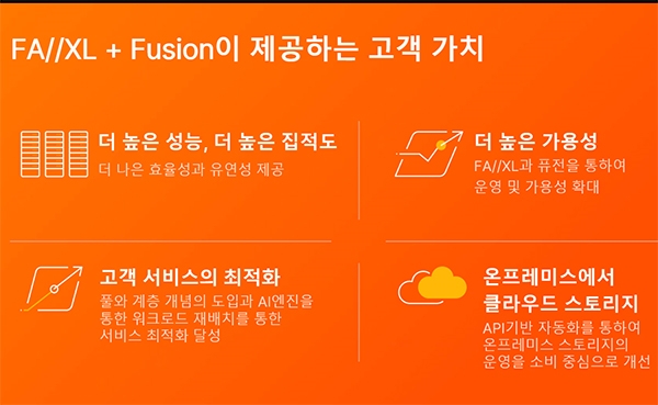 플래시어레이//XL과 퓨어 퓨전은 퓨어스토리지의 간소한 구독형 모델을 통해 스토리지 환경을 표준화하는 것과 동시에 새로운 차원의 확장성을 필요로 하는 고객들의 수요를 충족하도록 설계됐다.