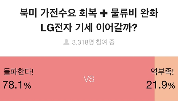이번 조사에서 3318명이 참여한 '북미 가전 수요 회복 + 물류비 완화…LG전자 기세 이어갈까?'라는 설문에 78.1%는 '돌파한다', 21.9%는 '역부족'이라고 답했다. 가전 수요 감소와 물류비 증가로 연내 다소 부진한 흐름을 보였던 LG전자를 바라보는 전망이 긍정적 기류로 바뀌고 있다.