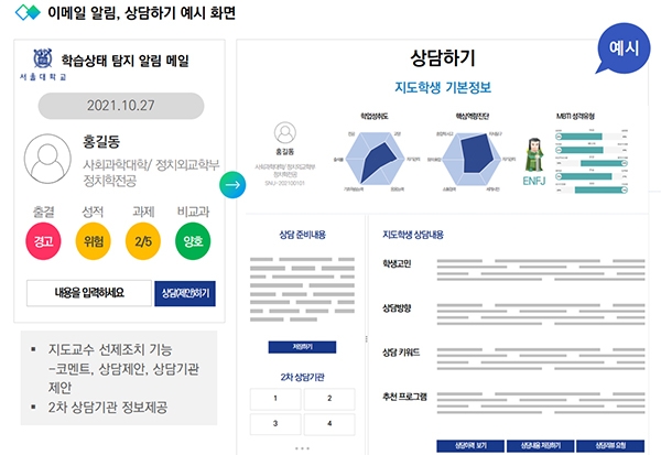 학사 정보 데이터에 기반해 대학생활에 어려움을 겪고 있는 학생들을 선제적으로 예측한 탐지 모델이 지도 교수에게 알림을 전송하며, 지도 교수는 학생의 고민 내용 확인부터 상담까지 원클릭으로 진행할 수 있을 뿐 아니라 학업 현황과 추천 교육 프로그램 등 정보도 함께 제공받을 수 있어 밀착·맞춤 상담이 가능하다.