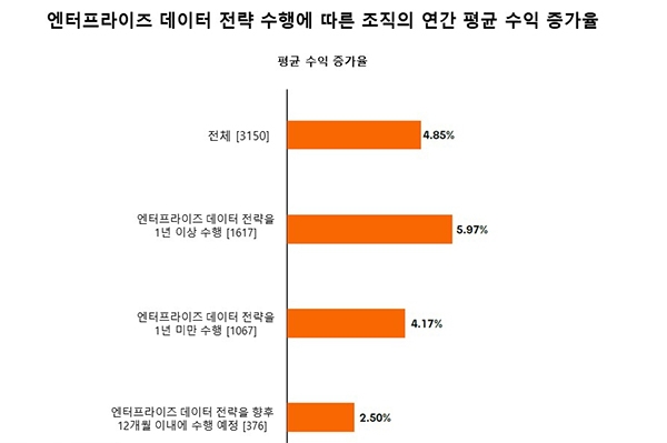이번 조사에 따르면 최소 1년간 성숙한 기업 데이터 전략을 운영한 조직은 평균 5.97% 더 높은 이익 성장률을 기록했으며, 응답자의 대다수(96%)는 데이터 처리 및 관리 방식이 기업 성과에 긍정적 영향을 미쳤다고 답했다.