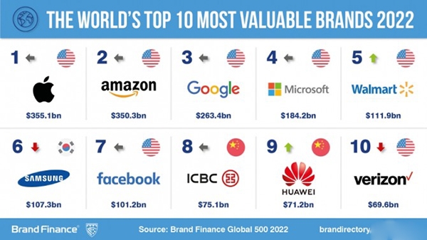 글로벌 브랜드 가치평가 및 전략 컨설팅 기관인 브랜드 파이낸스가 발표한 '2022년 글로벌 500대 브랜드' 보고서에 따르면 삼성전자는 1073억달러(약 129조원)로 월마트에 밀려 6위로 내려앉았다. 반면 화웨이는 712억달러(약 86조원)의 브랜드 가치를 인정받으며 지난해(15위) 대비 6계단 상승한 9위를 차지했다.