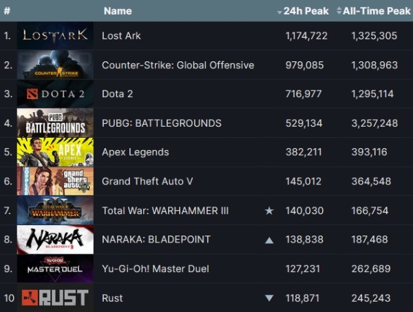 밸브 '카운터 스트라이크: 글로벌 오펜시브(CS:GO)'와 '도타2', 크래프톤 '펍지: 배틀그라운드'와 EA '에이펙스 레전드'와 락스타 게임즈 '그랜드 테프트 오토(GTA) 5' 등은 한 주 동안 제 자리를 지켰다.