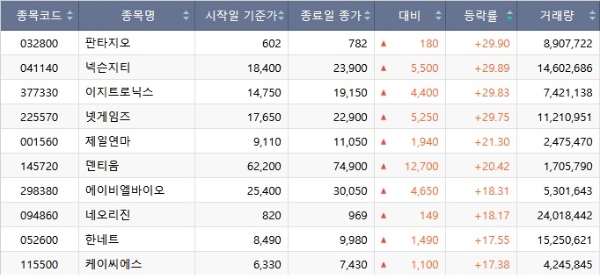 이미지 확대보기한국거래소(KRX) 발표에 따르면 코스피·코스닥·코넥스 통합 등락률서 넥슨지티가 주가 상승률 29.89%로 2위, 넷게임즈가 29.75%로 4위를 기록했다.