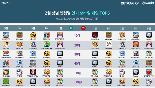 이미지 확대보기3대 마켓(구글 플레이스토어·원스토어·애플 앱스토어) 2월 총 이용자 순위는 ▲1위 로블록스 코퍼레이션 '로블록스' ▲2위 슈퍼셀 '브롤스타즈' ▲3위 전략적 팀 전투 ▲4위 쿠키런: 킹덤 ▲5위 네오위즈 '피망 뉴맞고'였다.