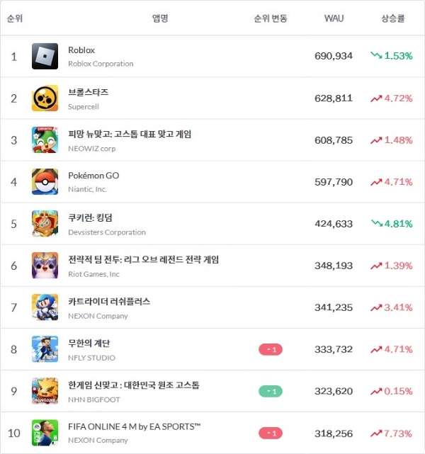 크래프톤 '배틀그라운드 모바일'이 WAU 29만8504명으로 '클래시 로얄'의 뒤를 이어 12위에 올랐으며 킹 '캔디 크러시 사가', 슈퍼셀 '클래시 오브 클랜' 등은 26만명대 WAU로 그 뒤를 이었다.