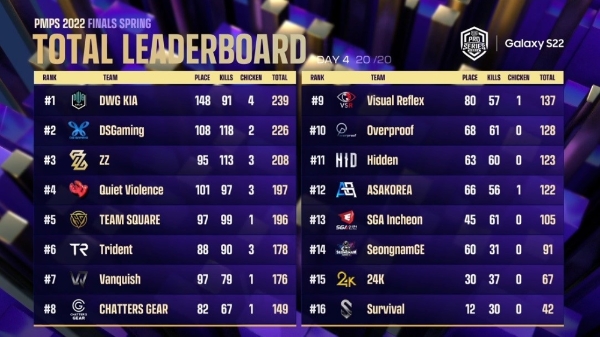 올해 시즌2 우승팀이었던 DS게이밍은 킬포인트 면에선 담원을 27점 앞서며 바짝 추격했으나 순위 포인트 면에서 40점 모자른 성적을 거두며 총점 13점 차이로 준우승을 차지했다.