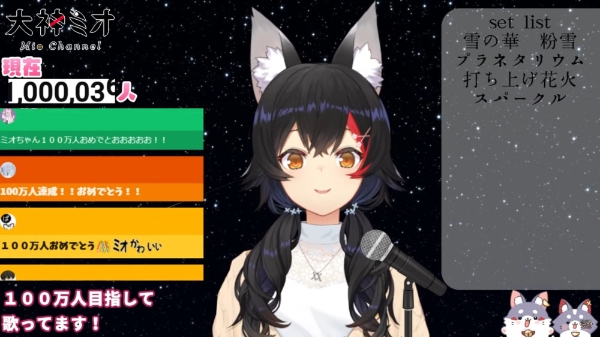 오오카미 미오는 채널 구독자가 약 99만5000명이었던 7일 오후 10시 노래 방송을 개시, 방송 시작 40분만에 100만 구독을 돌파했다. 100만명을 달성한 직후 울먹이는 목소리로 시청자들에게 고맙다고 말한 그녀는 11시 20분까지 노래를 부른 후 방송을 마무리했다.
