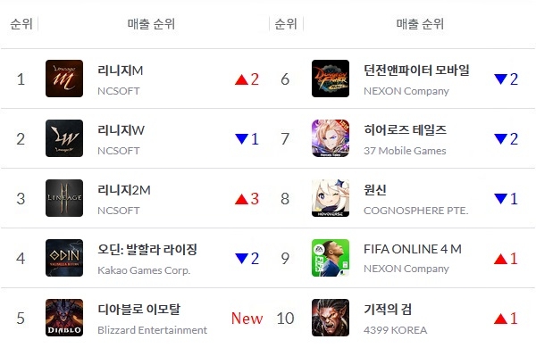 [모바일 게임 매출 순위] 6월 2주차, '디아블로 이모탈' 5위
