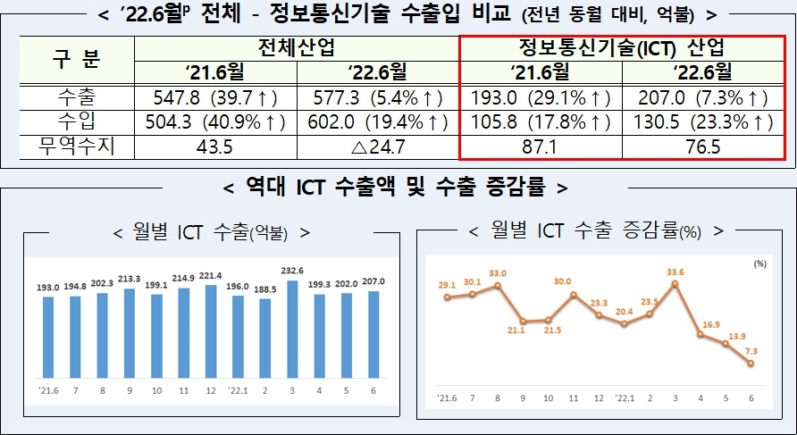 과기부 측은 "공급 불안정성 심화로 전체 무역 수출 적자를 기록했음에도 ICT 분야는 높은 수준의 수출 규모와 흑자를 동시에 기록했다"며 "중소·중견기업의 수출액 또한 상반기 기준 298억달러(약 39조원)로 전년 동기 대비 20.2% 증가했다"고 설명했다.