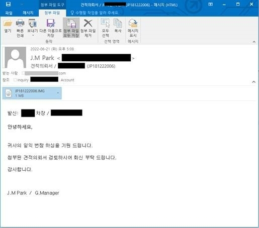 7월에는 선박 회사의 견적 의뢰서로 위장한 악성 메일이 발견됐다. 공격자는 실존하는 특정 선박 회사 담당자를 사칭해 가짜 메일을 유포했다. 해당 메일에는 ‘첨부된 견적의뢰서를 검토해달라’는 내용을 기입해 사용자가 첨부파일을 실행하도록 유도했다.