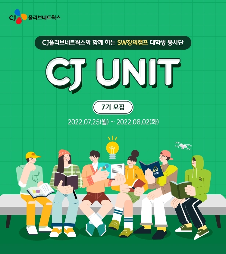 이번에 모집하는 'CJUNIT' 7기 대학생 봉사단은 8월부터 12월까지 5개월간 활동하게 된다. 강사 부문에 선발된 대학생들은 CJ올리브네트웍스 임직원들과 함께 체계적인 SW 교육활동을 지원하고 참가 학생들의 진로에 도움을 주는 멘토링에도 참여한다. 홍보부문 봉사단은 CJ SW창의캠프 SNS 홍보콘텐츠를 기획하고 제작한다.
