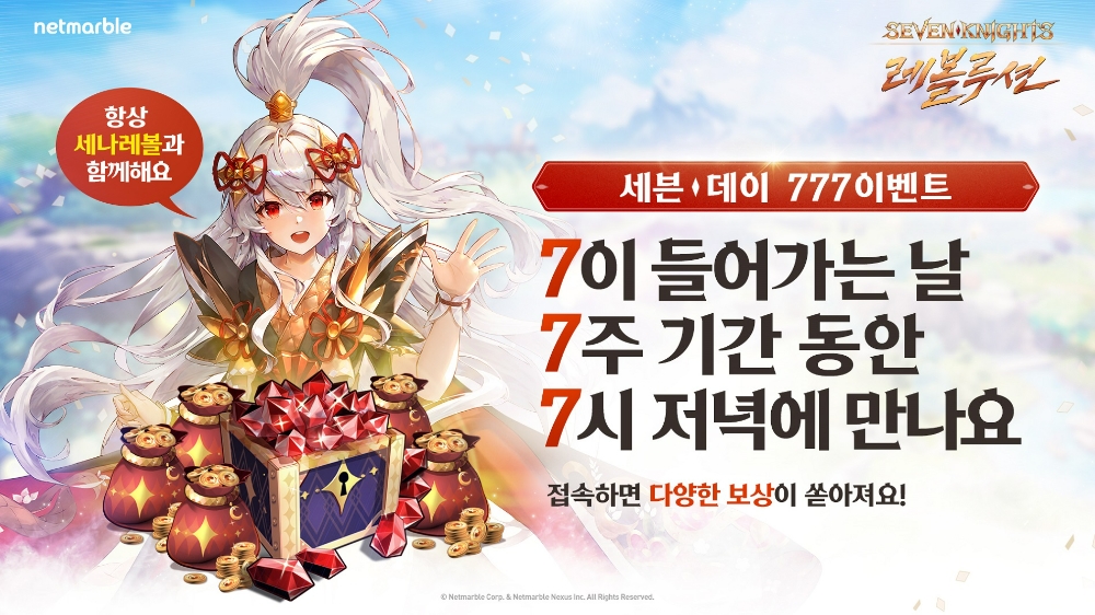 이미지 확대보기‘777 이벤트’는 숫자 7로 끝나는 일자에 게임 접속 시 오후 7시에 카드 소환권, 장신구 소환권, 루비, 골드 등의 보상을 제공하는 이벤트로 8월 7일부터 10월 7일까지 진행한다