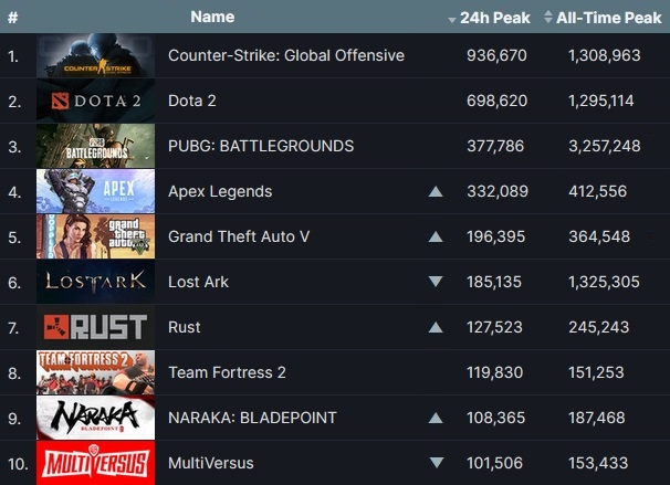 '러스트' 외에도 중국의 넷이즈가 개발한 배틀로얄 액션게임 '나라카: 블레이드포인트'가 13위에서 9위로 올라왔다. 지난주 9위, 10위를 차지했던 스튜디오 와일드카드 '아크: 서바이벌 이볼브드'와 캡콤 '몬스터헌터 라이즈'는 각각 최다 접속 9만6440명으로 11위, 8만3832명으로 13위를 차지했다.