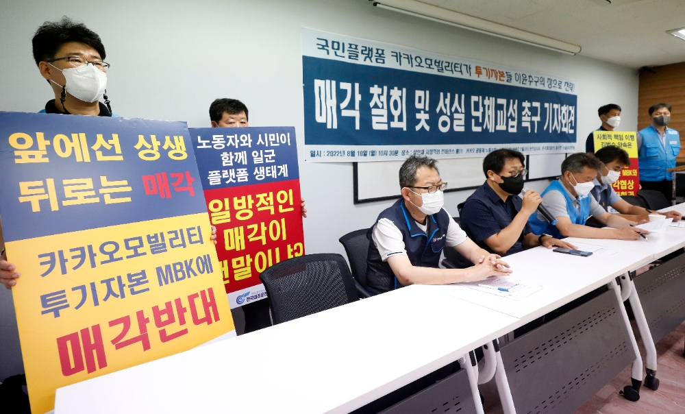 카카오노조는 "노동시민사회가 투기자본 MBK에 의한 플랫폼의 공공성 훼손을 우려하고 있다"며 "그런데 이미 카카오모빌리티에는 TPG라는 투기자본이 유입돼있다. 카카오는 이러한 상황을 만들어 온 것에 대한 진정성 있게 책임을 져야 한다"고 주장했다.