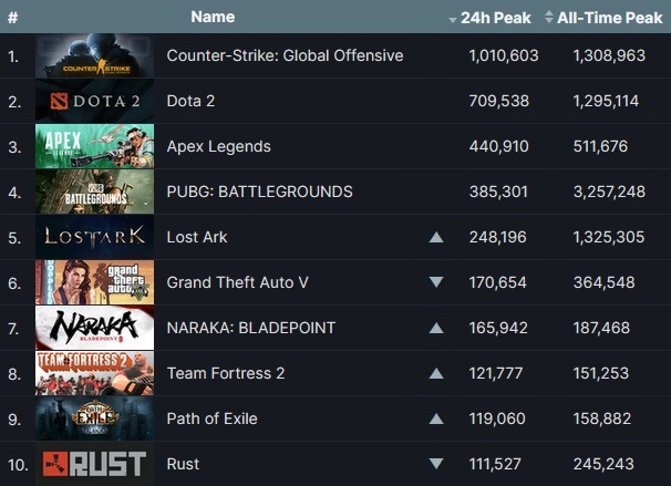 최다 동시 접속 톱4 사이 순위 변동이 없었던 가운데 스마일게이트 '로스트아크'가 전주 대비 11만1154명(81.1%) 많은 최다 동시 접속자를 기록, 5위 자리를 탈환했으며 넷이즈 '나라카: 블레이드 포인트', 밸브 코퍼레이션 '팀 포트리스 2' 등도 상승세를 보였다.