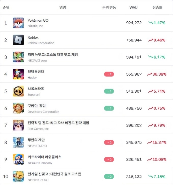 지난주 9위를 차지했던 킹 '캔디크러쉬사가'는 28만명대 WAU를 기록, 11위로 밀려났다. 넥슨 '피파온라인4M', 슈퍼셀 '클래시 오브 클랜', 마이크로소프트 '마인크래프트' 등이 근소한 차이로 그 뒤를 따르고 있다.