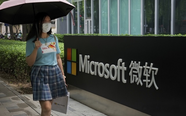 마이크로소프트 중국 베이징 사옥 앞을 한 여성이 지나가고 있다. 사진=AP통신·뉴시스