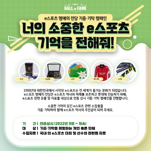 캠페인을 통해 수집된 기증·기탁품은 e스포츠 명예의 전당을 통해 전시된다. e스포츠 명예의 전당은 지난 2018년 8월 세계 최초로 개관한 e스포츠 기념 전시관이다.
