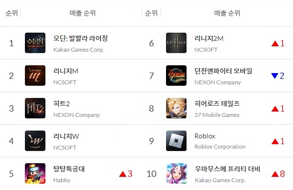 엔씨소프트 '리니지' 시리즈와 넥슨 '히트2', '던전 앤 파이터 모바일' 등이 상위권에 머무르고 있는 가운데 넷마블 '블레이드 앤 소울 레볼루션'이 11위를 차지했다. 파우게임즈 '프리스톤테일M' SP게임 '엑자일: 어벤징 파이어', 데브시스터즈 '쿠키런: 킹덤', 호요버스 '원신' 등이 그 뒤를 따랐다.