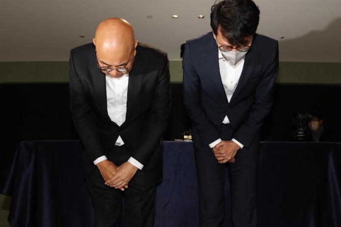 카카오 남궁훈·홍은택 각자대표가 19일 오전 경기도 성남시 판교 카카오 아지트에서 열린 '데이터센터 화재로 인한 장애' 관련 대국민 기자회견에서 고개 숙여 사과를 하고 있다. 사진=뉴시스, 공동취재사진